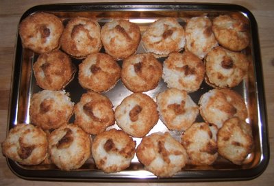 - Con esta masa se hacen montañitas y se van colocando en la bandeja del horno forrada con papel de estraza. Poner al horno precalentado a 200ºC Por arriba y por abajo hasta que estén dorados, habitualmente unos 15 minutos y coquitos listos.