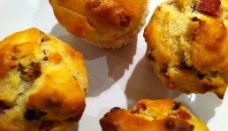 En otro cuenco batimos los huevos, añadimos la leche y el aceite y mezclamos todo. - Hacemos un hueco en el centro de los ingredientes sólidos y vertemos los ingredientes líquidos, el jamón y el queso rallado. Mezclamos todo, no tiene que quedar muy bien trabajado para que suban bien.