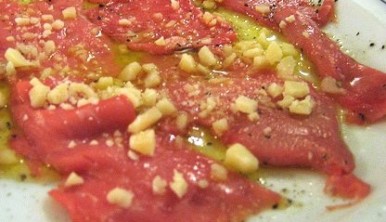 Primero introducimos el solomillo media hora en el congelador. Luego lo cortamos en filetes muy finos y los