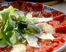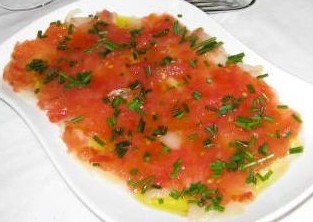 Primero lavamos los tomates y los cortamos en rodajas muy finas. Vamos colocando las rodajas en una fuente