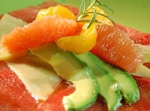 Pelamos y cortamos la sandía, la naranja y el aguacate en láminas muy finas y les quitamos las