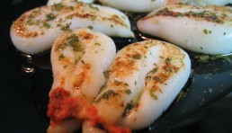 - Seguidamente calentamos unas gotas de aceite en una plancha y pasamos las zamburiñas brevemente, primero la zamburiña por el lado de la carne y le damos la vuelta quedando la cocha sobre la placha y acabamos de aliñar.