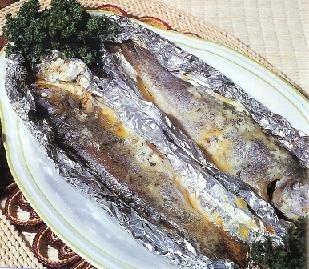 - Ponemos en una fuente el sofrito de ajo y cebollas y encima, colocamos las truchas. Regamos con la salsa de los champiñones, las cubrimos con papel de aluminio y las horneamos a 180º durante 10 minutos. Luego las sacamos del horno, les quitamos la piel desde la cabeza a la cola y las colocamos en una fuente, manteniéndolas al calor.