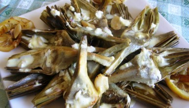 Primero precalentamos el horno a 180º. Luego limpiamos bien las alcachofas quitándoles las hojas duras y los rabos.